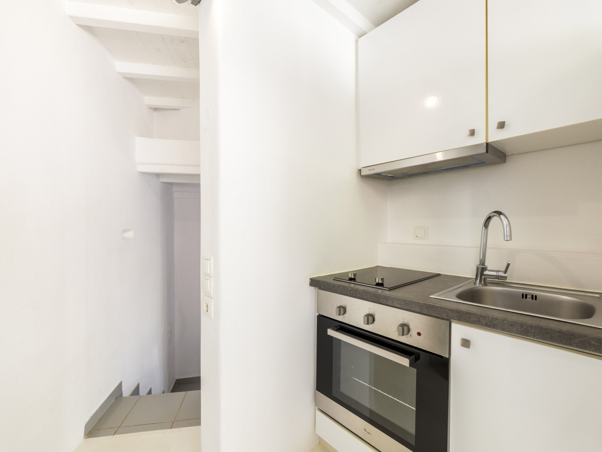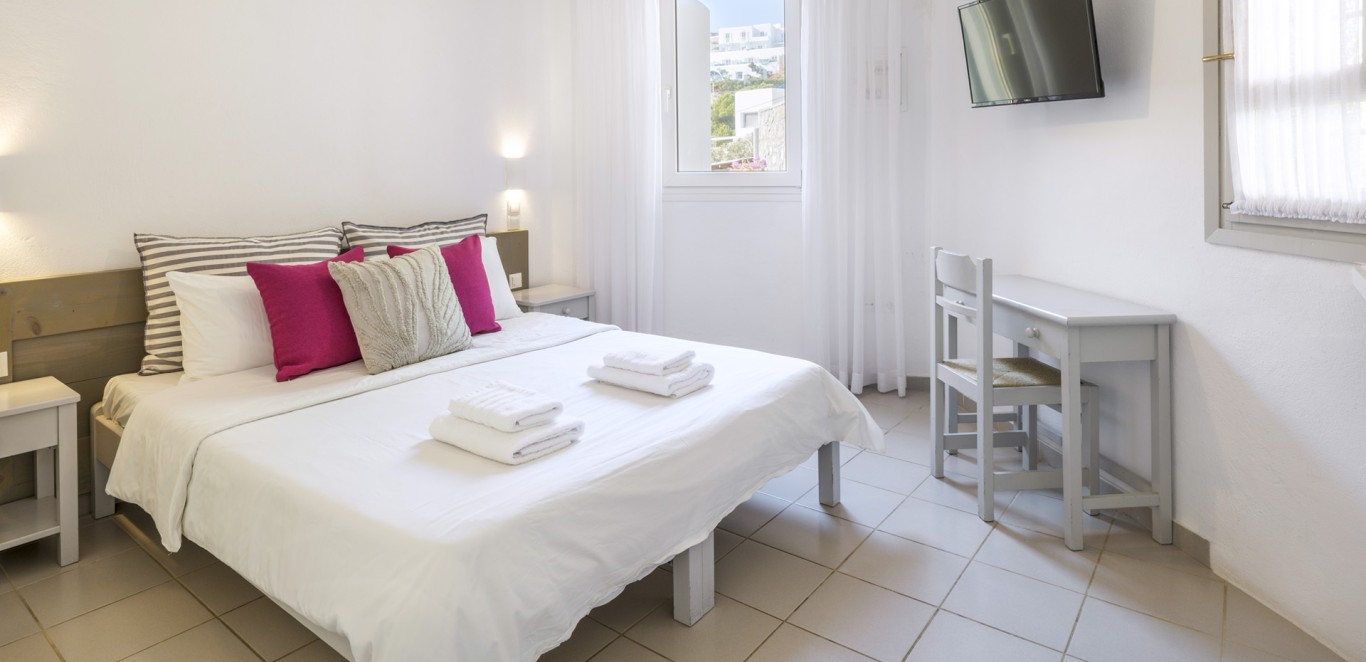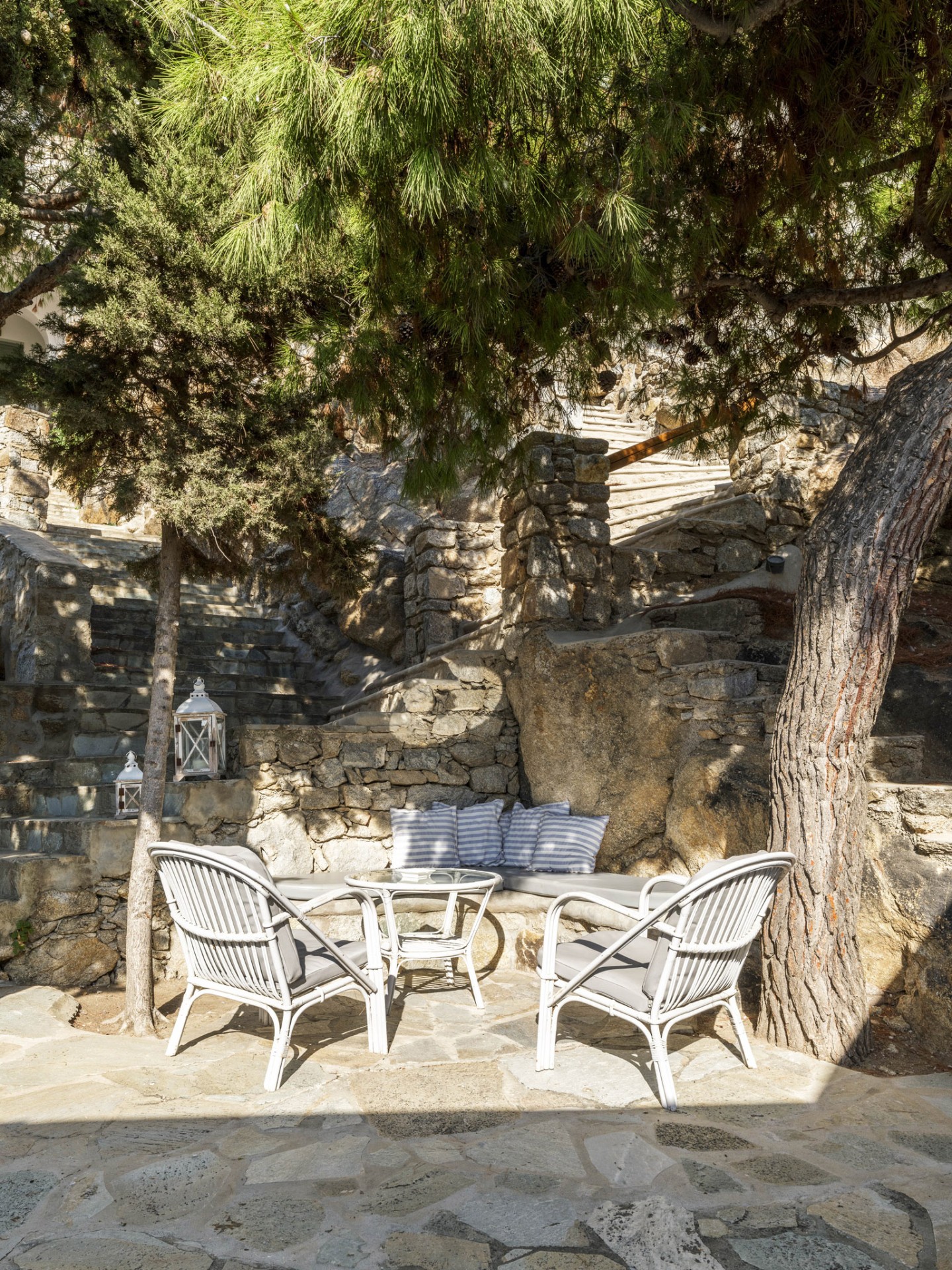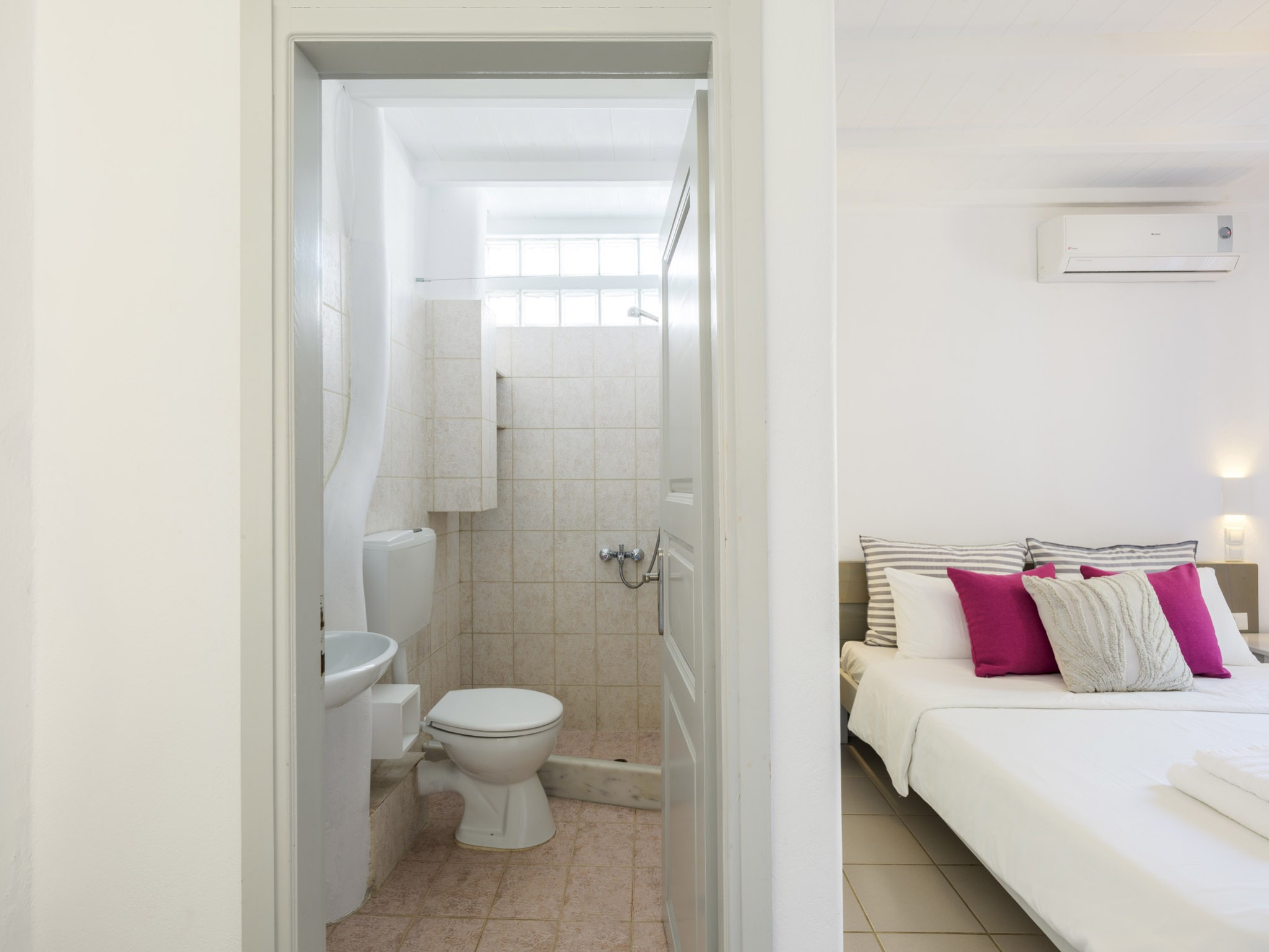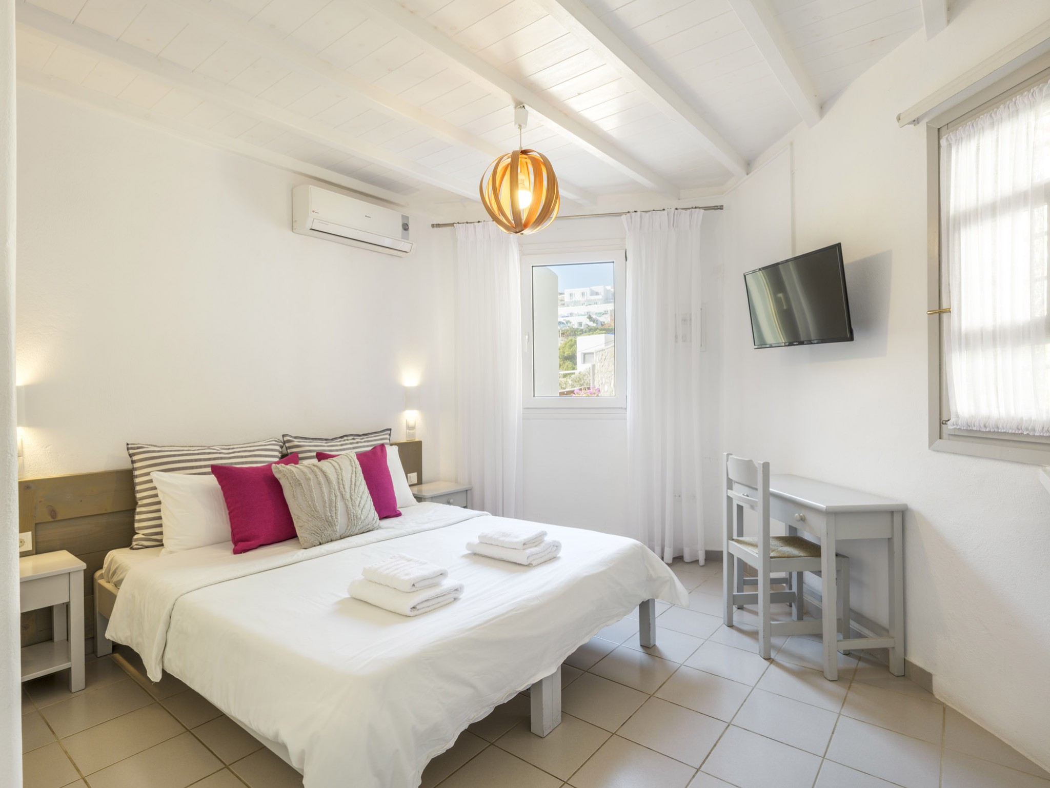 Our baby studio has a total area of 20 sq.m. Cute and cozy, it has been designed in such a way as not to lack facilities compared to other holiday homes. The bedroom has a queen-size matrimonial bed with an upper mattress, and the kitchen (fully equipped with an oven) is at the entrance, which makes it very easy to use for outdoor dining. A small built-in terrace is right outside, surrounded by trees, which is rather rare for Mykonos, and the large yard of our little chapel is a few steps away and features 180 views to the Aegean Sea.